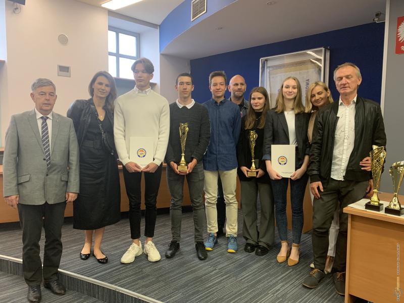 Uroczystość podsumowania współzawodnictwa sportowego szkół za rok szkolny 2021/2022 - sala sesyjna Urzędu Miasta 21.06.2022 r. Zwycięzcy w kategorii Licealiady, dziewczęta i chłopcy z IV LO im. H. Sienkiewicza.