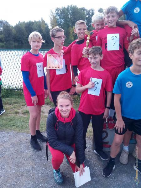 Miejskie Igrzyska Dzieci w sztafetowych biegach przełajowych: zwycięzcy z SP7 (opiekun Ola Wróblewska).