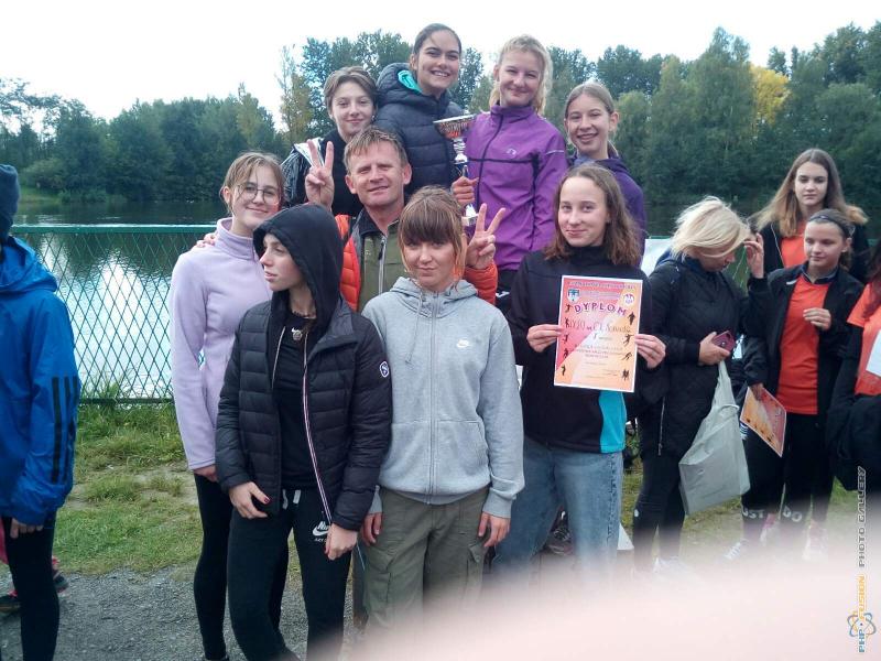 Miejska Licealiada w sztafetowych biegach przełajowych: zwyciężczynie z IX LO im. C. K. Norwida, opiekun Dariusz Gawroński.