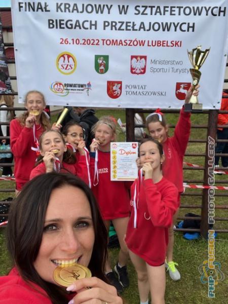 Złote medalistki Mistrzostw Polski Szkół w sztafetowych biegach przełajowych z SP7, nauczyciel Żaneta Trąbczyńska, skład: Zuzanna Pietrasińska, Maja Gradoń, Jagoda Trybuła, Paulina Deska, Amelia Młynarczyk i Emilia Majewska. 26.10.2022 r., Tomaszów Lubelski