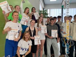 Miejska Licealiada w pływaniu. Zwyciężczynie z Sienkiewicza i 3m. chłopców z Sienkiewicza.