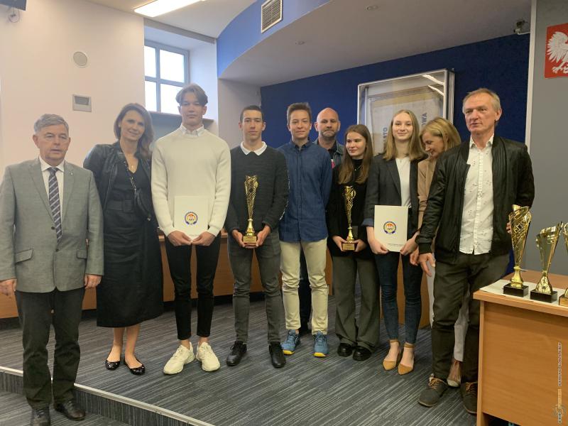 Uroczystość podsumowania współzawodnictwa sportowego szkół za rok szkolny 2021/2022 - sala sesyjna Urzędu Miasta 21.06.2022 r. Zwycięzcy w kategorii Licealiady, dziewczęta i chłopcy z IV LO im. H. Sienkiewicza.