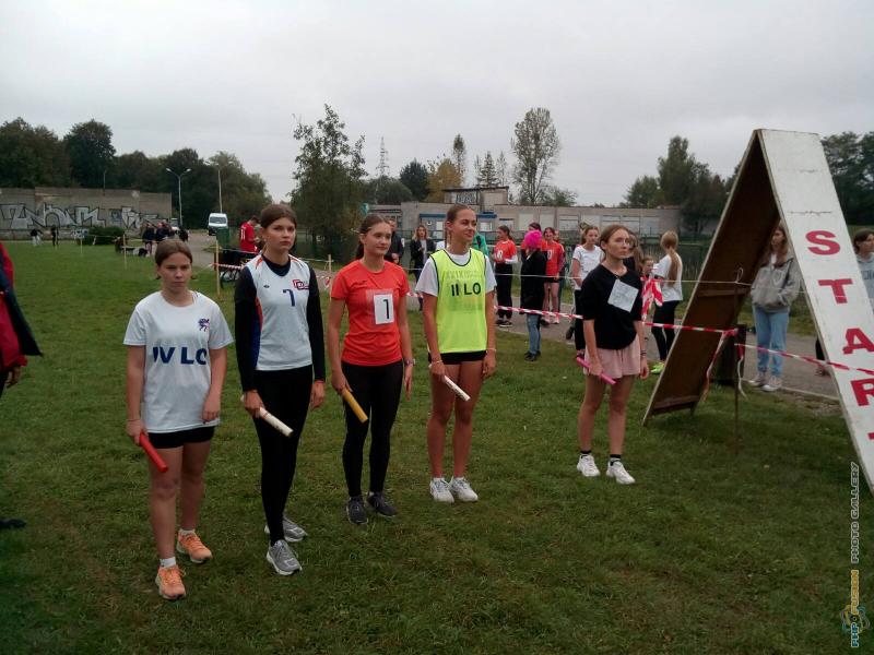Rejonowe sztafetowe biegi przełajowe, start do biegu licealistek.