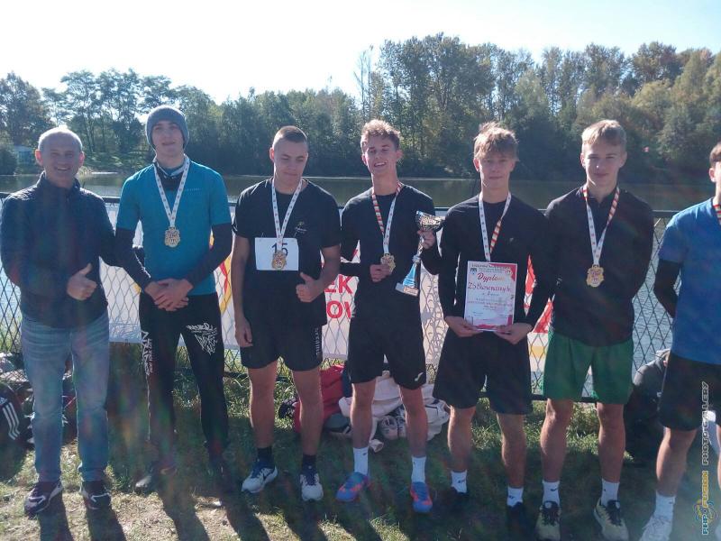 Miejska Licealiada w sztafetowych biegach przełajowych. Zwycięzcy z ZS Ekonomicznych, opiekun: Maciej Saboczyński